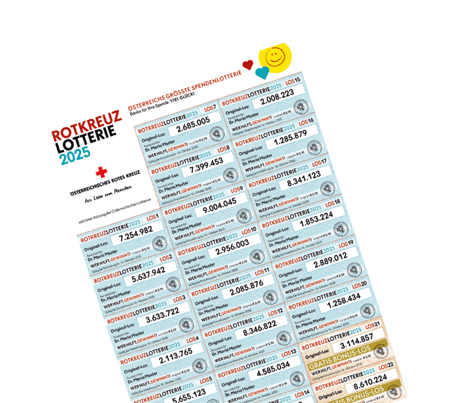 Die ROTKREUZ LOTTERIE ist für alle ein Gewinn – für die tausenden Gewinner:innen der letzten Jahre ebenso wie für uns vom Roten Kreuz. Denn der Reinerlös unterstützt unsere Arbeit und ermöglicht es uns, all jenen zu helfen, die unsere Hilfe brauchen. Rund um die Uhr. Aus Liebe zum Menschen.